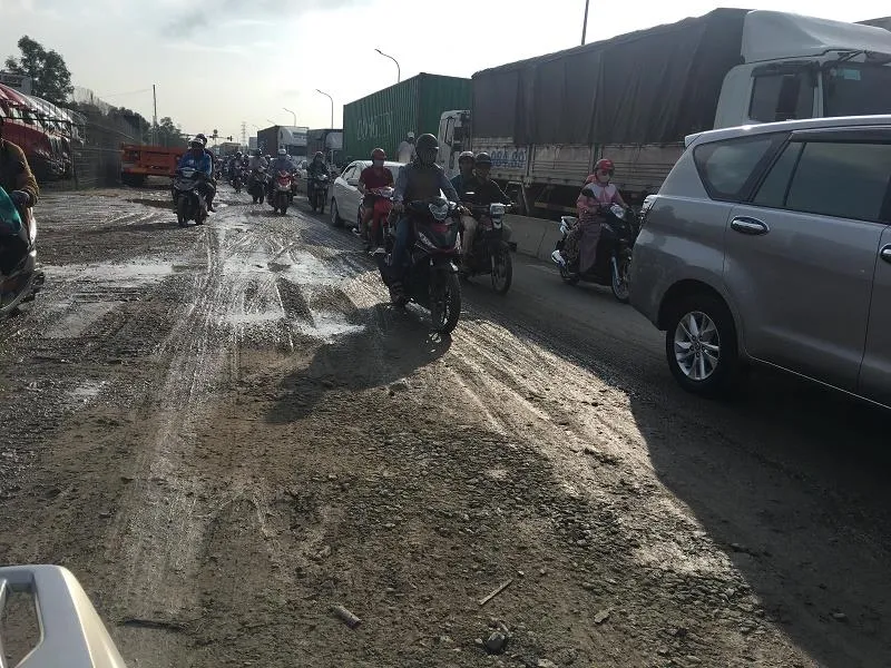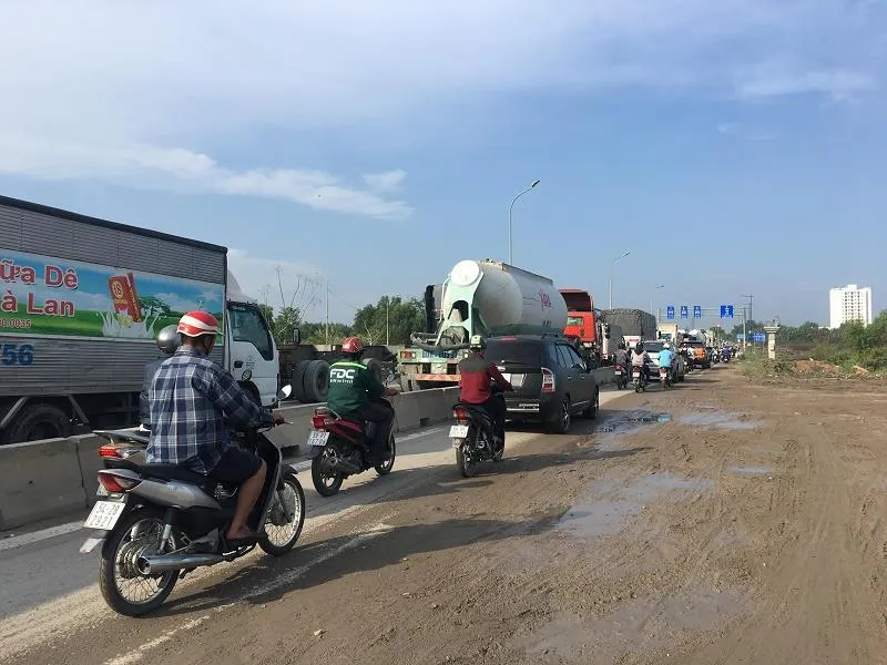 Cụ thể, tuyến đường Võ Chí Công, tình trạng kẹt xe kéo dài từ vòng xoay Phú Hữu đến cầu Phú Mỹ. Nhiều tài xế chán nản, mệt mỏi xuống khỏi xe container, xe tải đứng đợi chờ cho hết kẹt xe.