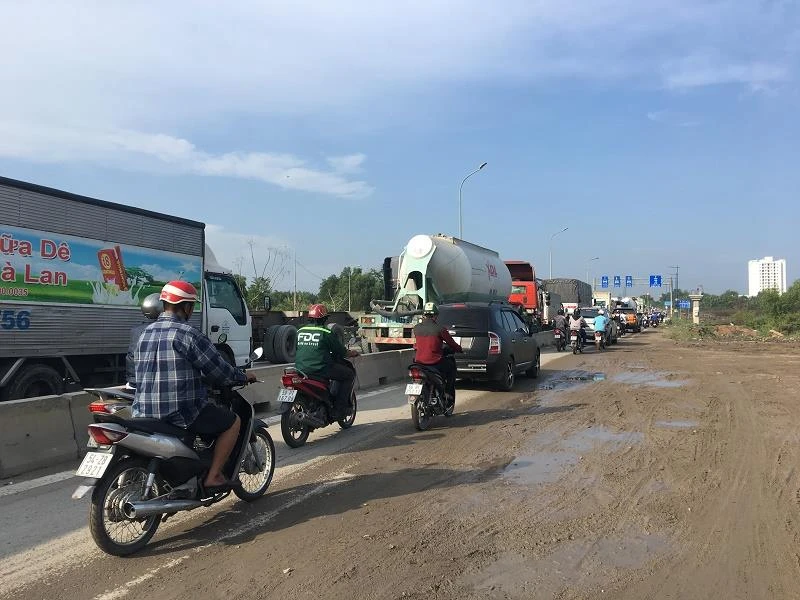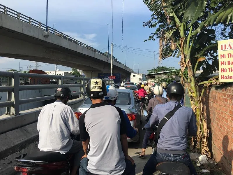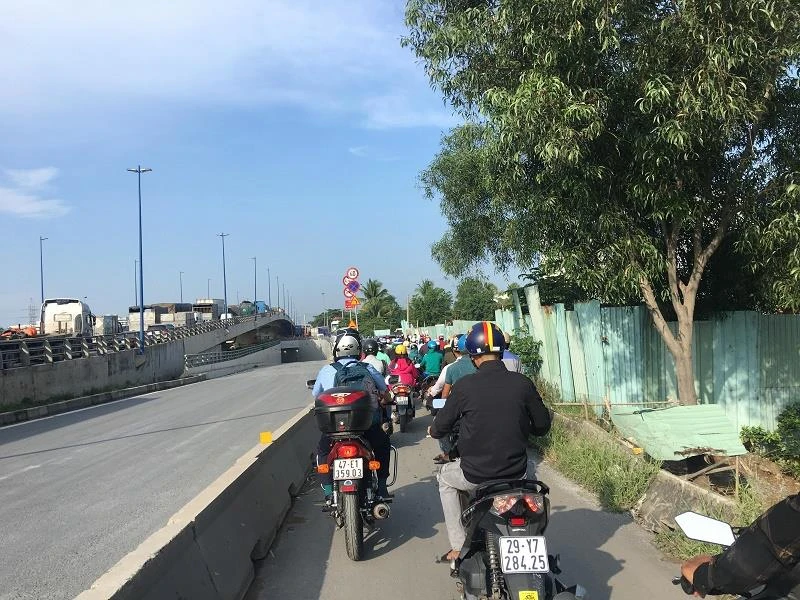 Tương tự, tuyến đường Võ Chí Công, hướng từ quận 9 sang quận 2, làn đường dành cho xe máy cũng lâm vào tình cảnh kẹt xe kéo dài vì nhiều xe ô tô lấn làn để vượt qua khỏi cảnh ùn tắc.