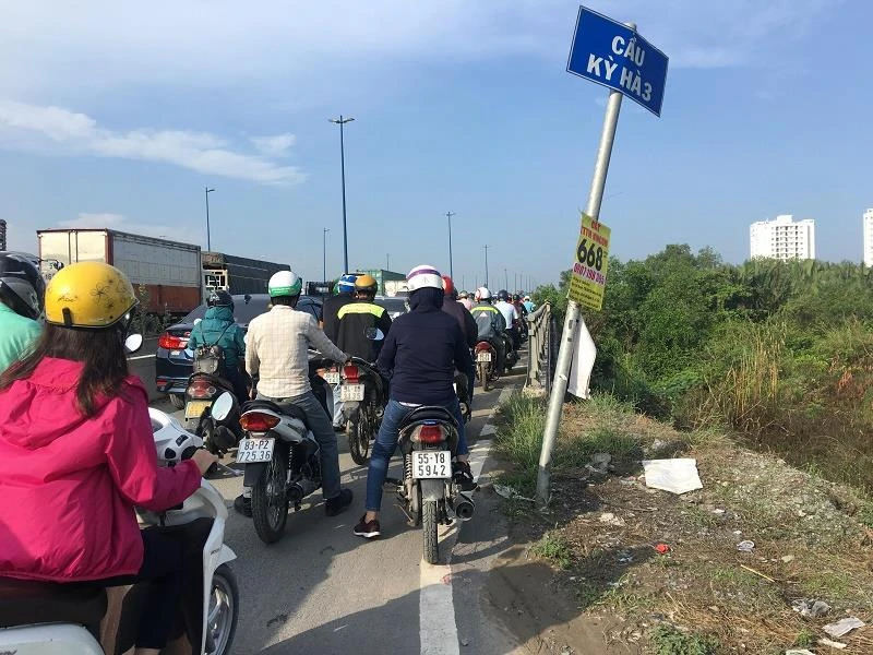 Cầu Kỳ Hà kẹt xe kéo dài. Ảnh: ĐÀO TRANG.