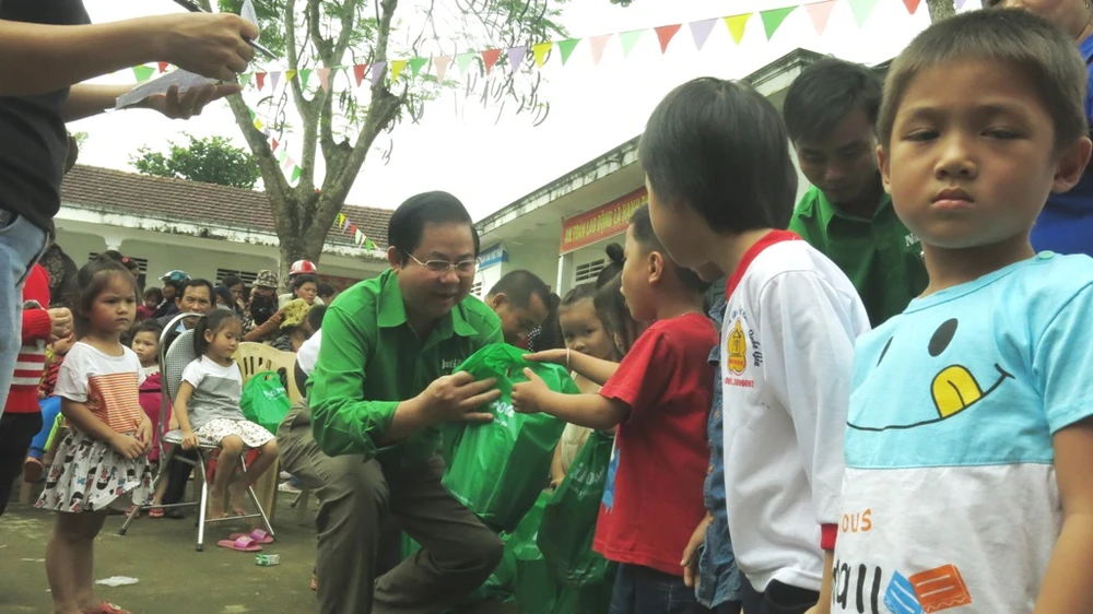 Ông Lâm Văn Hải, Giám đốc điều hành Công ty NutiFood, trao quà cho các bé mầm non ở Hương Khê - Hà Tĩnh