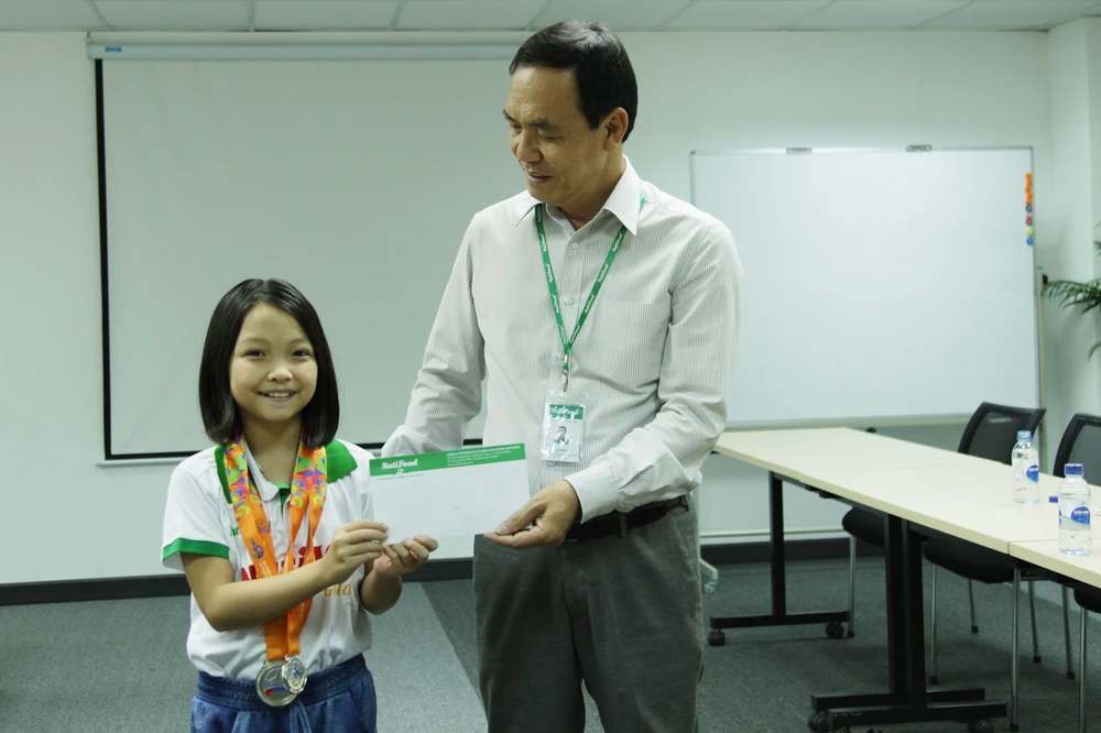Lãnh đạo Công ty NutiFood thưởng nóng cho kỳ thủ Cẩm Hiền.
