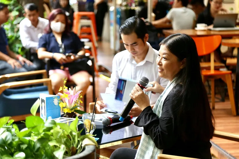 Tác giả Nguyễn Phi Vân giao lưu với độc giả tại buổi ra mắt sách. ẢNH: Facebook tác giả.