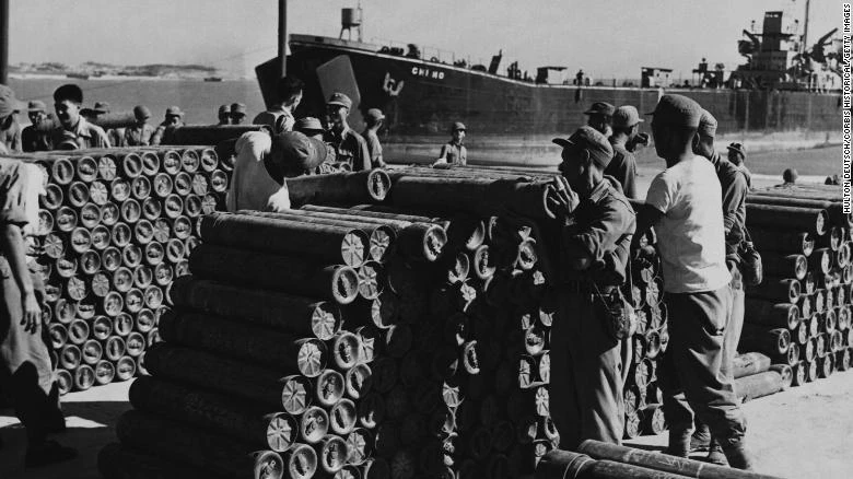 Lính Đài Loan chất đạn pháo tại cảng biển trên đảo Quemoy vào năm 1958, trong khoảng thời gian xảy ra cuộc khủng hoảng eo biển Đài Loan. Ảnh: CNN