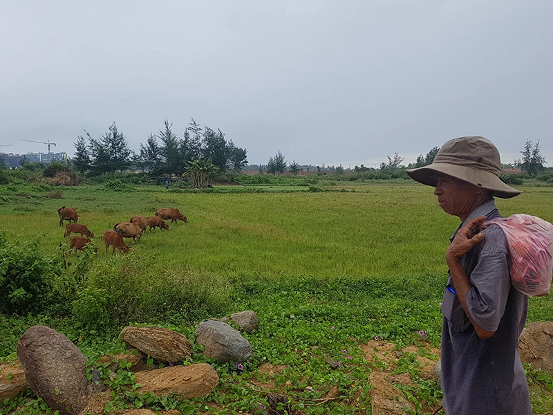 Đồng ruộng của ông Nguyễn Bay, 64 tuổi, ngụ phường Điện Ngọc, thị xã Điện Bàn, Quảng Nam gồm 20 sào ruộng trồng lúa và đủ loại hoa màu nằm lọt thỏm trong dự án khu đô thị (KĐT) số 4 (tên thương mại Sun River City) do Công ty CP Giao thông vận tải Quảng Nam làm chủ đầu tư.