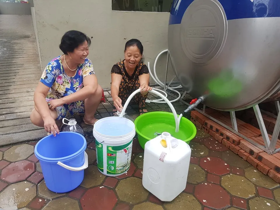 Ngồi chờ đến lượt, bà Nguyễn Thị Hiên (60 tuổi, chung cư VOV) cũng cho biết ban ngày con cái bận đi làm, đợi con về mới đi xách nước thì xếp hàng rất lâu nên đầu giờ chiều bà tranh thủ xuống lấy nước. Nhà đông người, lượng nước dùng nhiều nên mỗi lần lấy nước, bà Hiên phải dùng can nhựa, thùng nhựa có dung tích 20 lít để đỡ phải đi lại nhiều.