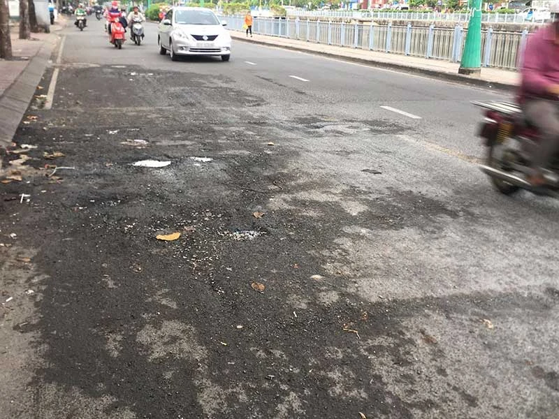 Theo ghi nhận của PV, đoạn đường trên thuộc địa bàn phường 11, quận 3. Tại đây xuất hiện vài ổ gà, hố lớn nhất đường kính khoảng 30 cm, sâu khoảng 10 cm. Mặt đường khá gồ ghề, có nhiều đá nhỏ nằm chi chít trên mặt đường. Theo quan sát, có nhiều người đang đi với tốc độ nhanh đến đoạn đường này thì thắng gấp, bánh xe trượt trên mặt đường.