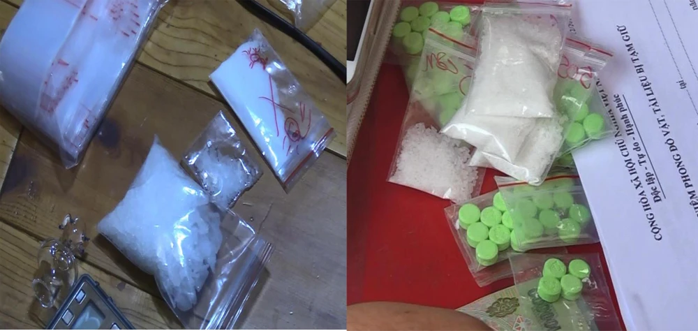 Khám xét nhanh, lực lượng công an thu giữ trên người nhóm này và tại căn nhà trên nhiều ma túy đá, 109 viên thuốc lắc, 34 triệu đồng, 1 khẩu súng rulo với 30 viên đạn.