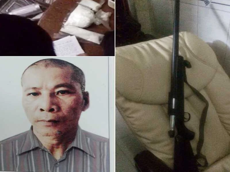 Khám xét nhà của nghi can, công an thu giữ hơn 1,7 kg ma túy đá, heroin, súng và khuôn dập thuốc lắc.
