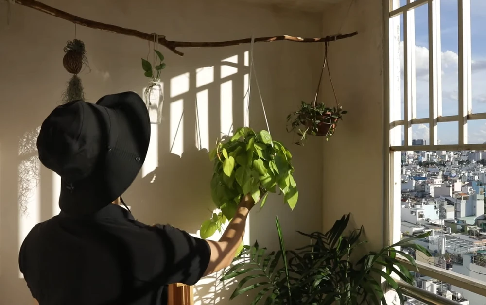 Mạnh Hà đặt chậu khoai lang vào miếng gỗ pallet, treo lên cao để tiết kiệm không gian. Ảnh: NVCC