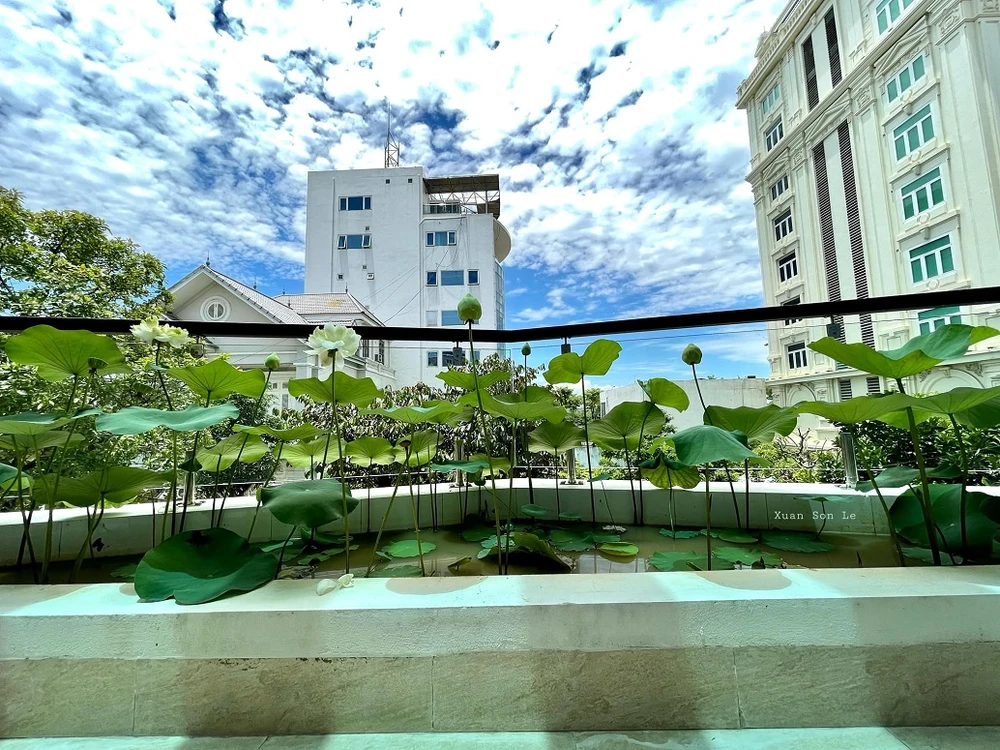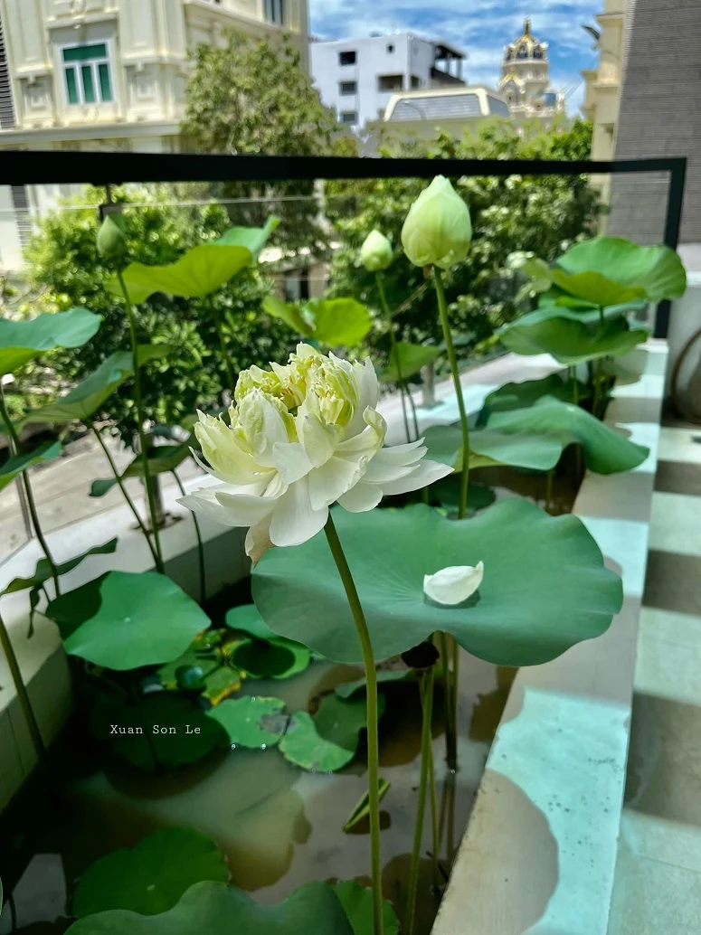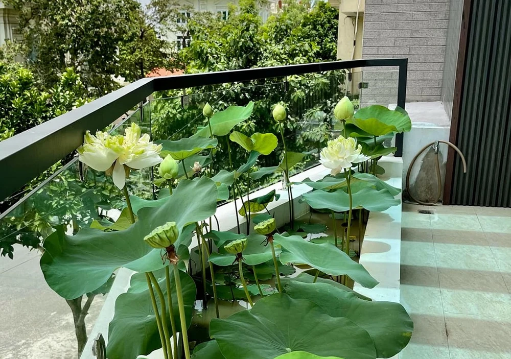 Không muốn lãng phí ban công rộng rãi, Lê Xuân Sơn (24 tuổi, ở Ninh Bình) đã làm bồn hoa, đổ đất và bơm nước để trồng hoa sen quan âm.