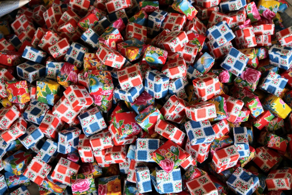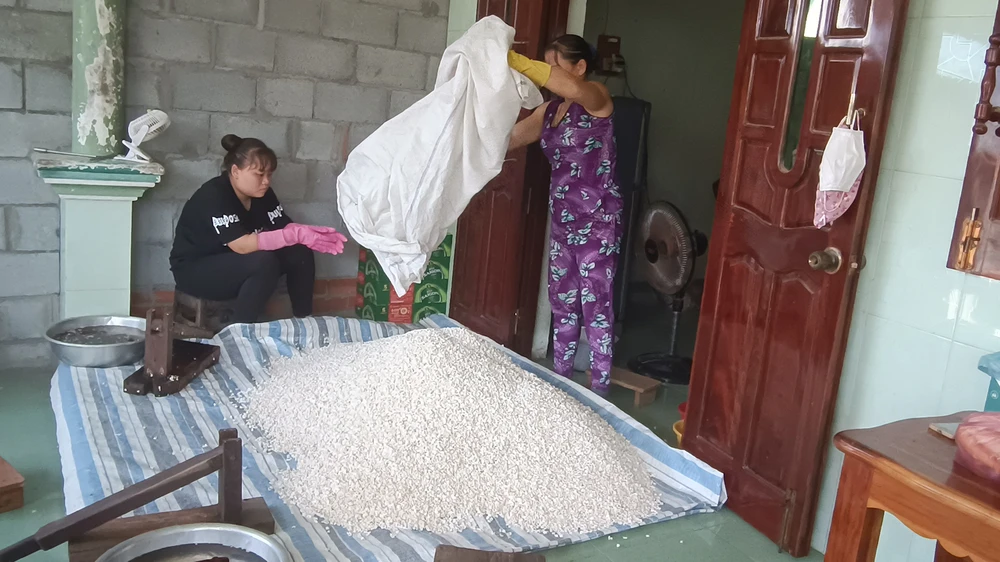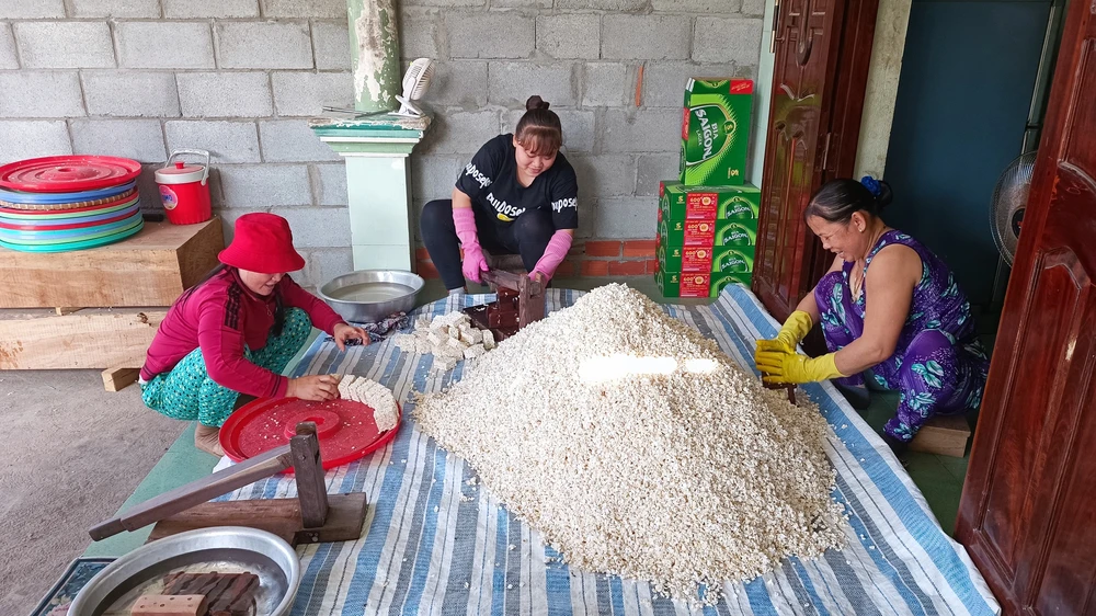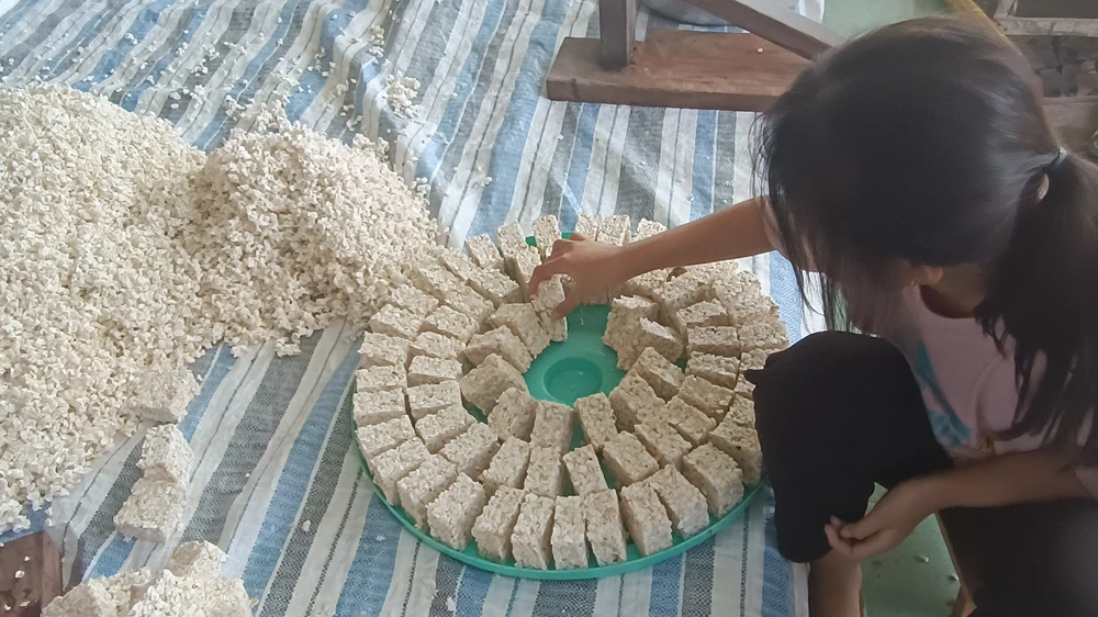 Trên sảnh trước nhà trải 1 tấm bạt nhựa những người trong gia đình ngồi quây quần, mỗi người 1 công đoạn, cùng với 2 khuôn ép làm luôn tay, 1 buổi cũng ép được 2 – 3 chục kg nổ. Trung bình mỗi kg nổ, gia đình chị ép được 52 bánh cốm. Cốm ép được phơi khô, gói trong giấy màu rồi giao cho bạn hàng đặt trước, lấy công làm lời mỗi chục ký cốm thành phẩm cũng được 100 ngàn. Nếu ai đặt làm thì có thể ép cốm to nhỏ và bỏ thêm mứt trái cây, nước dứa ép hoặc vỏ quýt xắt sợi theo ý người đặt. Có năm gia đình chị định bỏ nghề, nhưng gần tết hàng xóm và cả những người ở các thôn, xã bên cạnh tới hỏi mua, đặt hàng và cũng vì nhớ cái không khí rộn ràng cảnh tết ngày xưa, nên gia đình lại giở khuôn ra ép. Mọi năm chỉ có 2 vợ chồng và đứa con gái nhỏ ép cốm, nên làm được ít. Năm nay bạn hàng đặt nhiều, may nhờ con trai và đứa cháu đang học đại học năm thứ 3, vì dịch bệnh ở nhà học online cùng phụ giúp, nên chắc mùa tết này gia đình cũng ép được khoảng 1 tấn nổ.