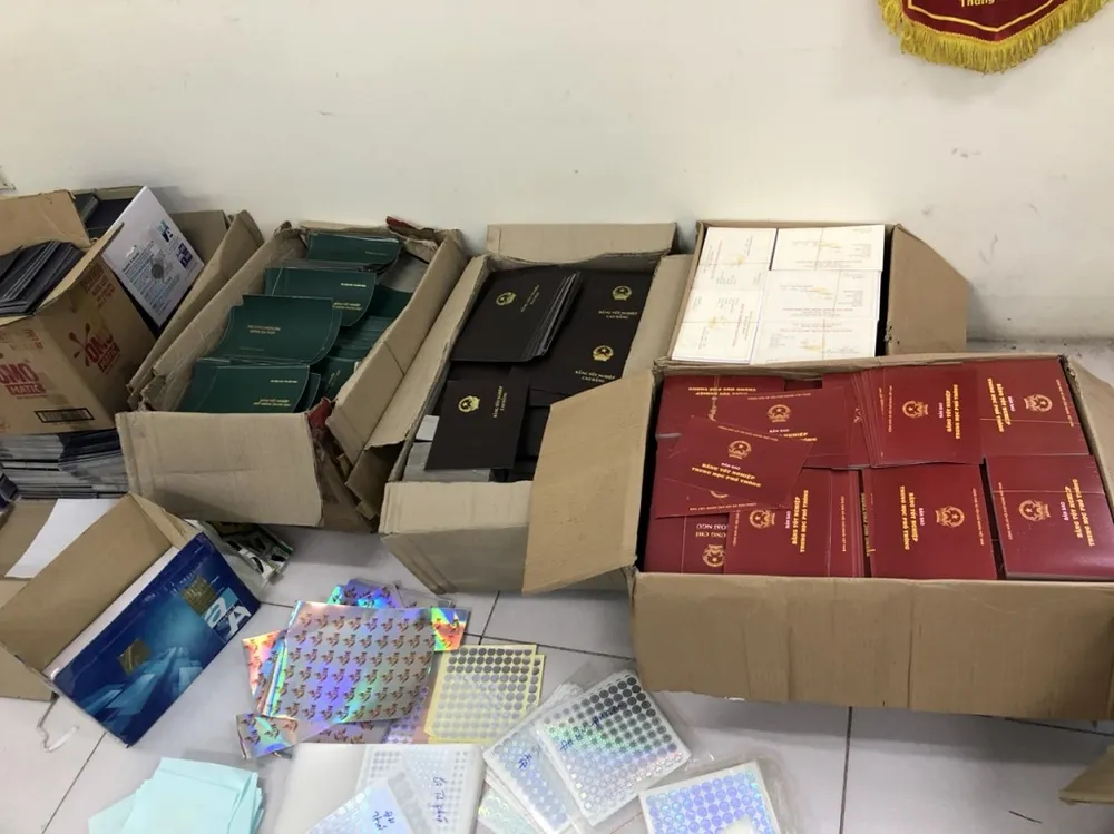 Khám xét tại ngôi nhà tại phường 8, quận Gò Vấp, TP.HCM - nơi hai bị can thuê để sản xuất các loại văn bằng, chứng chỉ, công an thu giữ gần 4.000 con dấu, hơn 5 tấn phôi các loại giấy tờ tùy thân, văn bằng, chứng chỉ như Căn cước công dân, Giấy phép lái xe, Bằng Thạc sỹ, Bằng tốt nghiệp Đại học, tốt nghiệp Trung học phổ thông, Chứng chỉ Ngoại ngữ, Tin học...