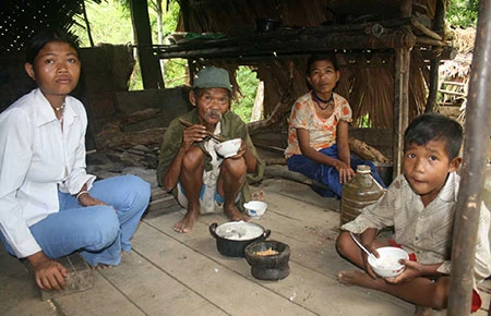 Đã có bốn hộ dân người Mã Liềng vào lại rừng sâu. Người ở bản như gia đình Hồ Siêm thì cuộc sống cũng không khá mấy, bữa ăn chỉ có cơm trắng muối vừng. Ảnh: MINH QUÊ