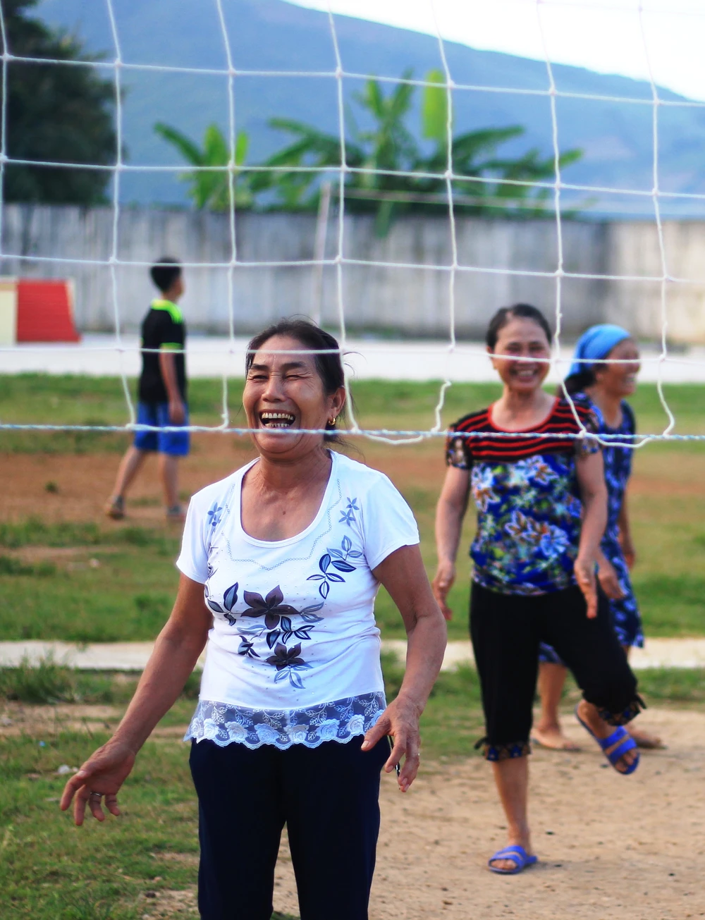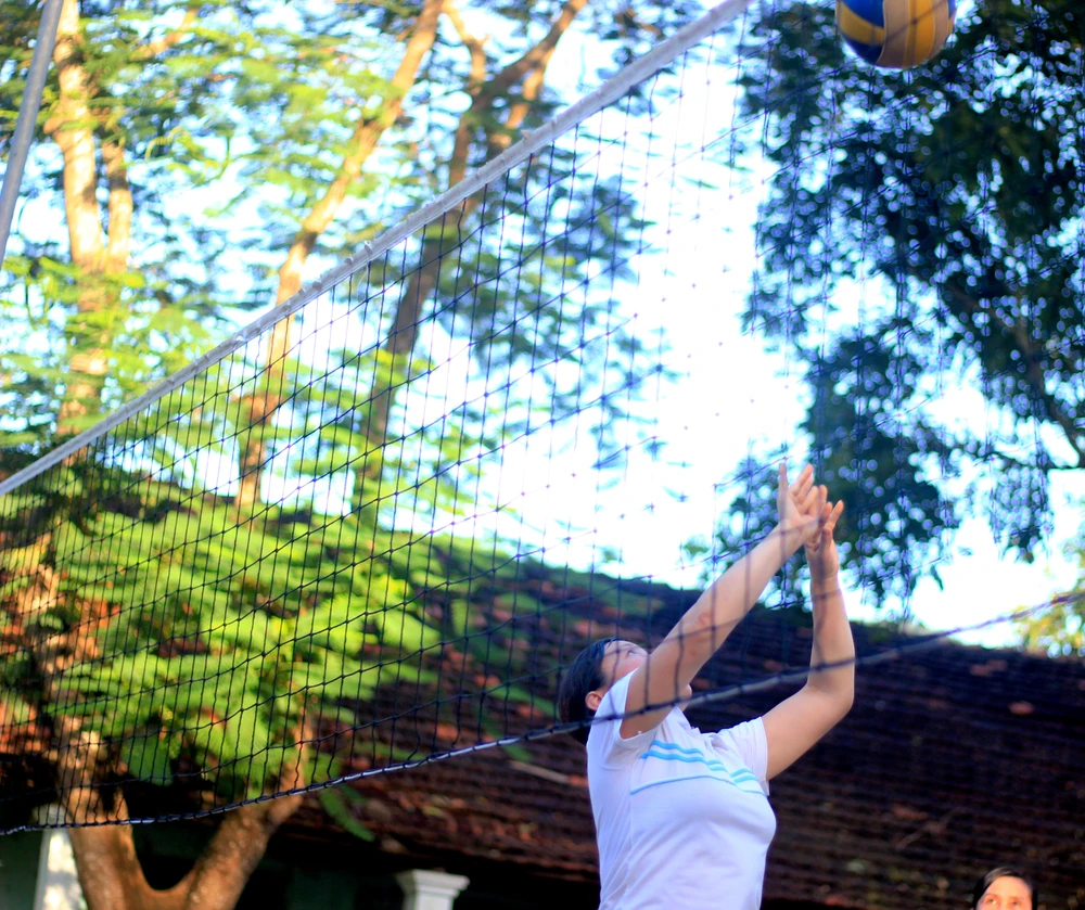 Ở một sân bóng chuyền khác, phụ nữ và đàn ông chia làm hai sân thi đấu với nhau.