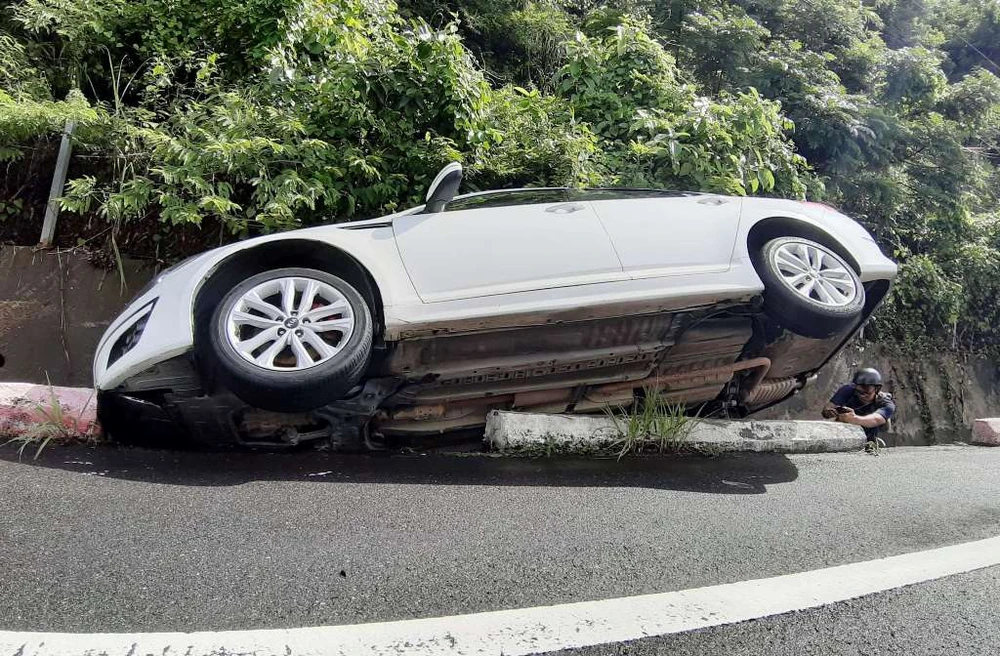 Chiếc ô tô lao mạnh, va vào vách núi, lật nghiêng rồi mắc kẹt dưới rãnh thoát nước bên đường. Tài xế bung cửa thoát ra ngoài, may mắn không bị thương.