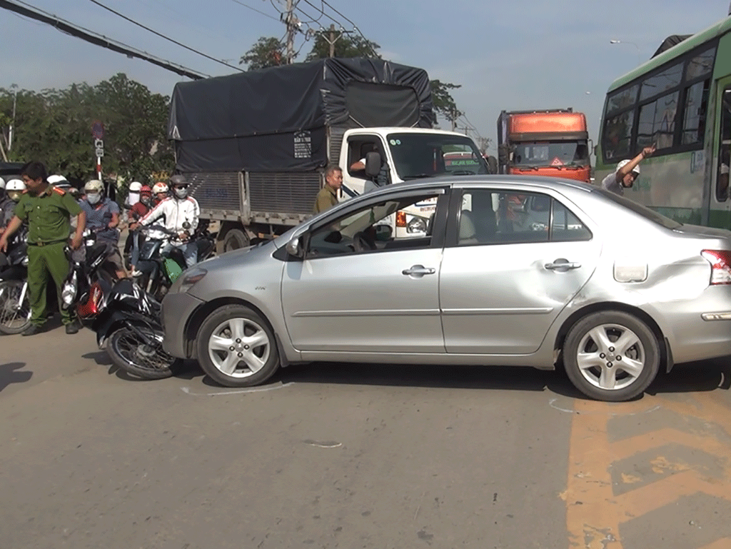Cú va chạm khiến xe ô tô mất lái loạng choạng lao sang làn đường bên cạnh tông trúng vào xe máy biển số 55Y3… do người đàn ông trung niên cầm lái.