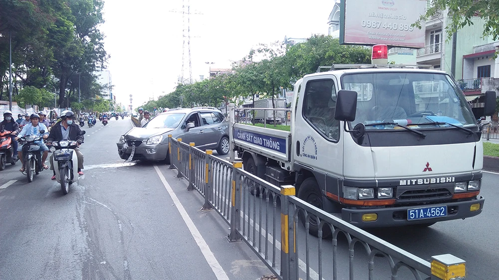 Sáng 26-5, ô tô bảy chỗ biển số TP.HCM chạy trên đường Kinh Dương Vương hướng từ quận 11 về quận Bình Tân. Khi đến khu vực Công viên Phú Lâm (quận 6, TP.HCM) thì bất ngờ mất lái, tông ngã đổ dải phân cách bằng thép, lao qua làn xe máy.