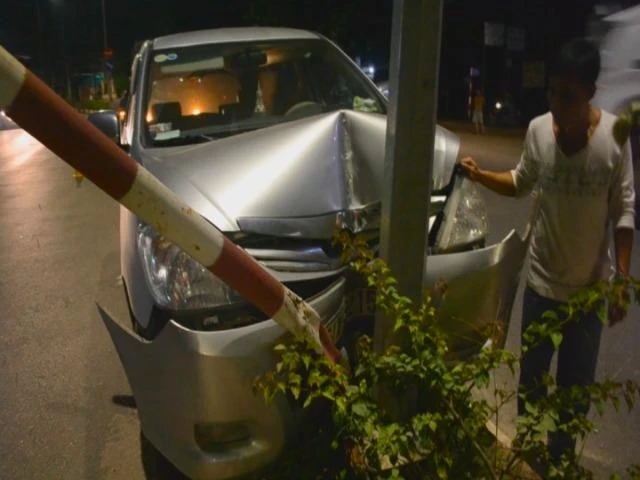 Tại hiện trường, phần đầu xe ô tô bị biến dạng. Cú tông quá mạnh khiến cột biển báo giao thông bị gãy đổ và tài xế Trần Thanh Thảo bị thương.