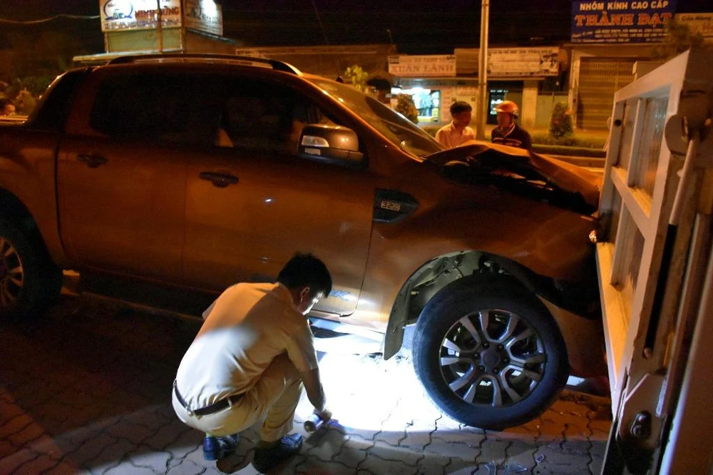 Ô tô 81C-091.45 không giảm tốc độ, lao thẳng lên vỉa hè, đâm vào chiếc xe thùng của cảnh sát rồi đẩy đi nhiều mét khiến xe cảnh sát va chạm với một ô tô tải khác.