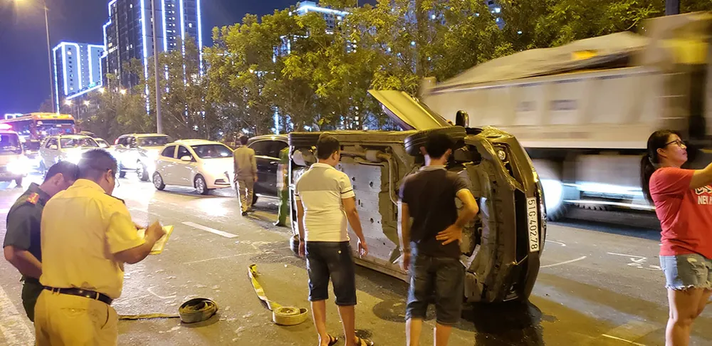 Vụ lật xe xảy ra trên đường Đồng Văn Cống (quận 2) tối ngày 23-2. Ảnh HT.