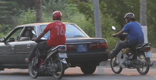 Khoảng 17 giờ chiều 1-3, trên tuyến QL61C - đoạn thuộc địa bàn huyện Vị Thủy (tỉnh Hậu Giang), người đi đường ngạc nhiên với hình ảnh ô tô biển xanh 68C-0255 được hai thanh niên chạy trên hai xe máy kè phía sau đẩy chạy trên đường.