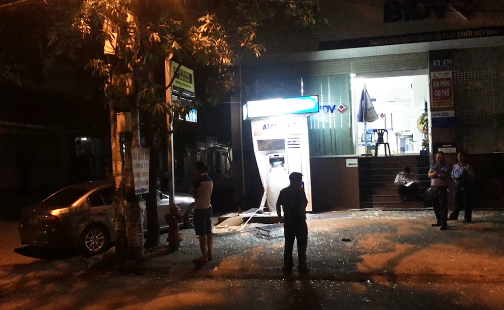 Chiếc ô tô tông trúng trụ ATM Ngân hàng BIDV lúc rạng sáng. Ảnh: H.Tâm