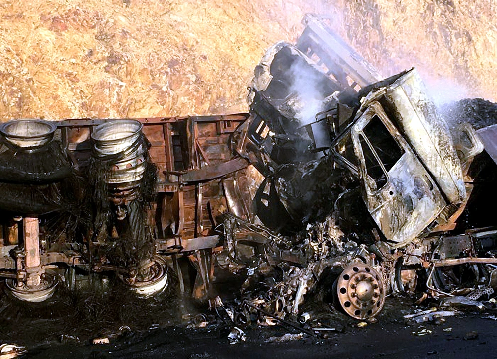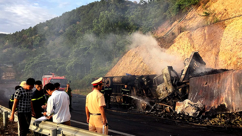 Vụ va chạm mạnh khiến hai chiếc xe bị lật nhào. Gần như ngay lập tức, phương tiện chở xoài bốc cháy dữ dội khiến ba nạn nhân mắc kẹt trong xe không kịp thoát ra ngoài. Tài xế container chở gỗ may mắn thoát nạn trước khi xe bị cháy và lật.