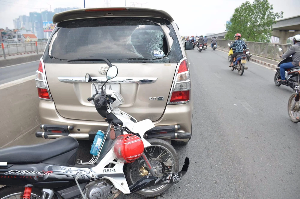 Cú va chạm khiến người phụ nữ bị đập mạnh vào kính chắn gió phía sau xe ô tô và ngã ra đường. Nạn nhân bị thương nặng, được tài xế xe 7 chỗ đưa đi bệnh viện cấp cứu.