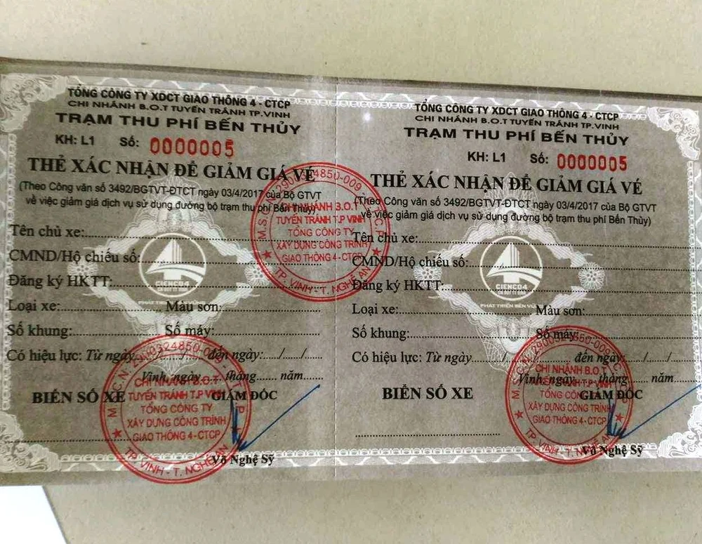 Mẫu thẻ xác nhận, khi đi qua trạm thu phí Bến Thủy 1 và Bến Thủy 2, chủ xe phải xuất trình thẻ này để được mua vé giảm 50%.