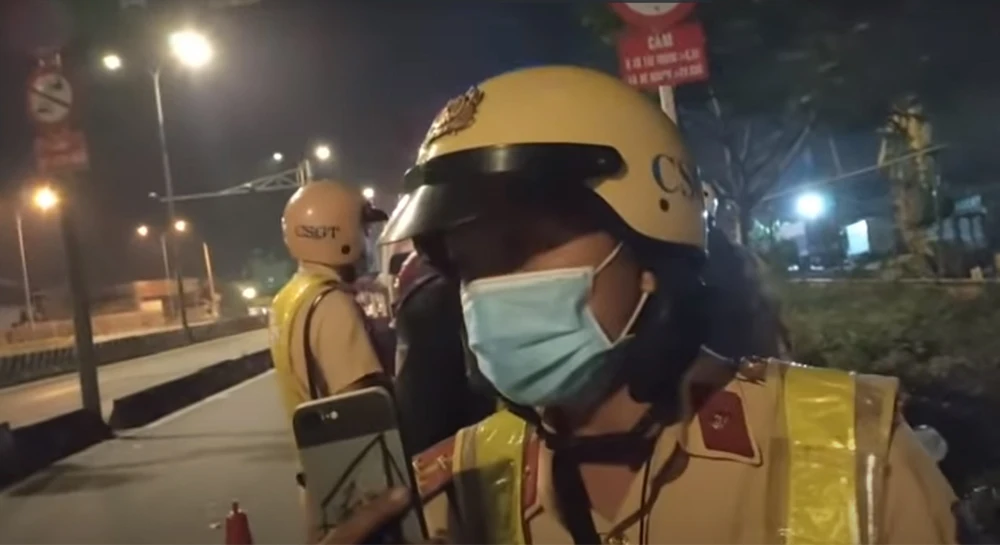 Một CSGT cũng cầm điện thoại như đang quay phim và yêu cầu: “Đề nghị anh đi ra khỏi khu vực đo nồng độ cồn. Lúc này một người trong nhóm quay phim nói: “Anh đề nghị vì lý do gì. Anh không đề nghị được, đừng xô đẩy. Anh đang lấn chiếm lòng lề đường của người đi bộ…” – một người nói trong clip.