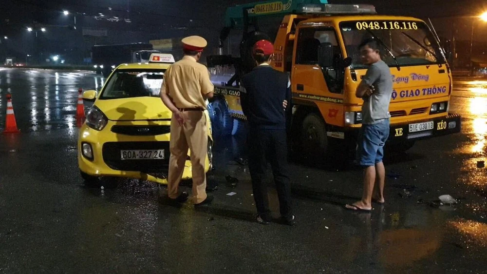 Vụ tai nạn chưa được giải quyết xong thì một chiếc xe taxi chạy quốc lộ 13 lại đâm thẳng vào đuôi ô tô cứu hộ khiến chiếc xe taxi hư hỏng phần đầu.