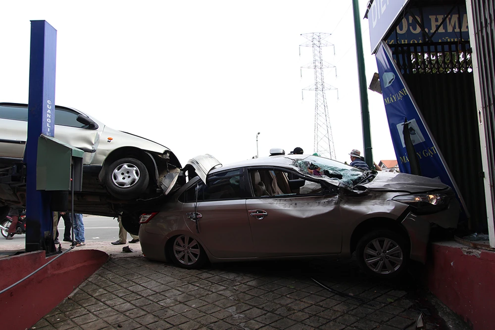 Vụ va chạm còn khiến chiếc ô tô đang được sửa chữa bị hư hỏng.