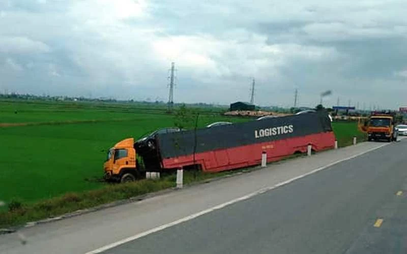 Vì tránh một xe ngược chiều, tài xế Bình đạp thắng, thời điểm này mặt đường trơn trượt nên xe đầu kéo chao đảo rồi lao xuống ruộng lúa bên đường.