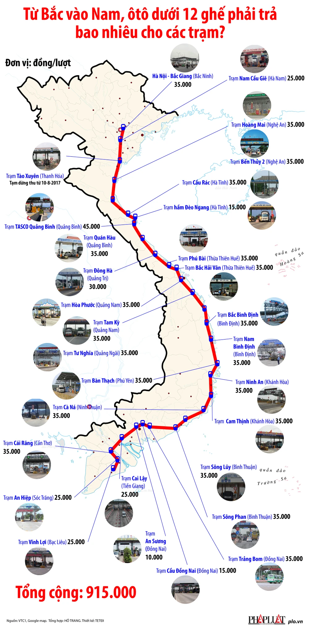 (PLO) - Một xe ô tô dưới 12 chỗ ngồi, đi theo Quốc lộ 1 từ Bắc vào Nam phải trả gần 1 triệu đồng cho các trạm thu phí BOT.