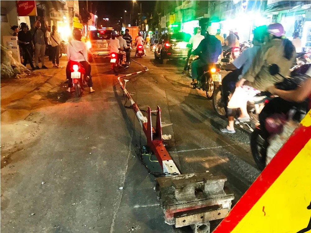 Vụ việc khiến thanh chắn đường sắt bị tông gãy, hai trụ điện bên đường cũng bị nghiêng. Ảnh hưởng từ sự cố khiến giao thông qua khu vực ùn ứ nghiêm trọng.