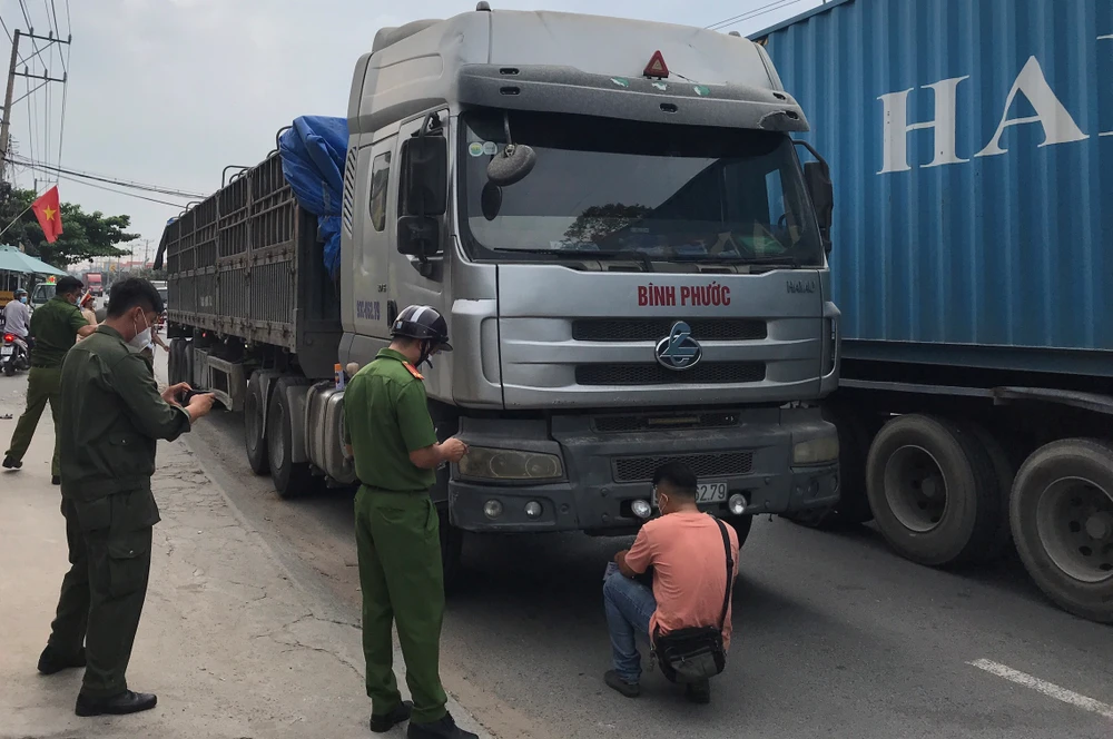 Chiều 28-3, Công an TP Dĩ An, tỉnh Bình Dương đang khám nghiệm hiện trường để làm rõ nguyên nhân vụ tai nạn nghiêm trọng giữa xe đầu kéo và một xe máy khiến đôi vợ chồng tử vong.