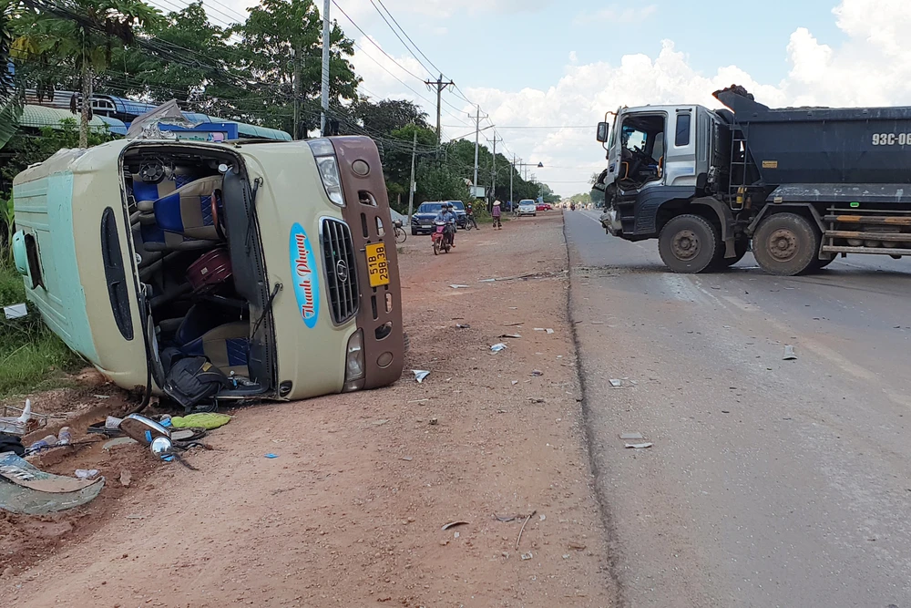 Khi đi đến đoạn qua xã Tân Thành, TP Đồng Xoài thì bất ngờ bị chiếc xe ben 93C-061.98 đang lưu thông theo hướng ngược lại lao qua phần đường của xe khách.