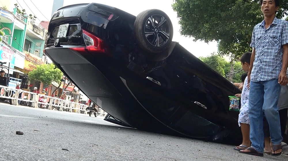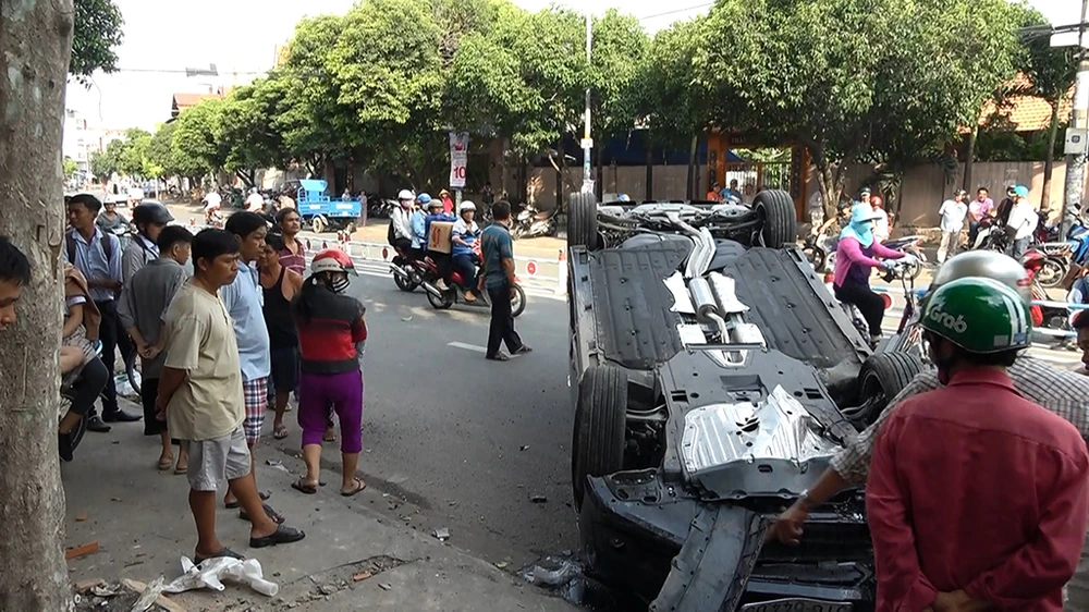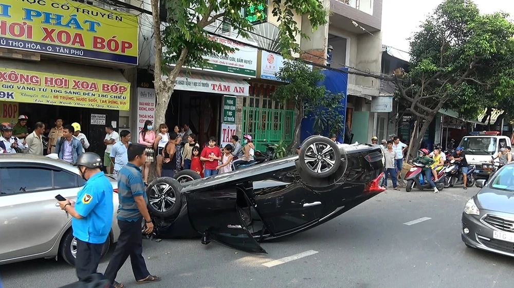 Chiếc xe lật ngửa sau khi tông liên hoàn trên vỉa hè. Ảnh Nguyễn Tân.