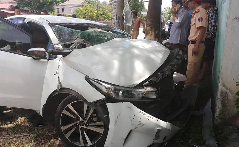 Chiếc xế hộp bị hư hỏng nặng sau vú chạm mạnh với gốc cây ven đường quốc lộ 1A trước khi quay đầu sang phía nhà dân.