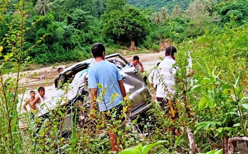 Tại hiện trường cho thấy, chiếc xe sau khi lật nhào nhiều vòng bị hư hỏng nặng, nhiều bộ phận nát bét. Chiếc xe suýt lao xuống sông Nậm Nơn.