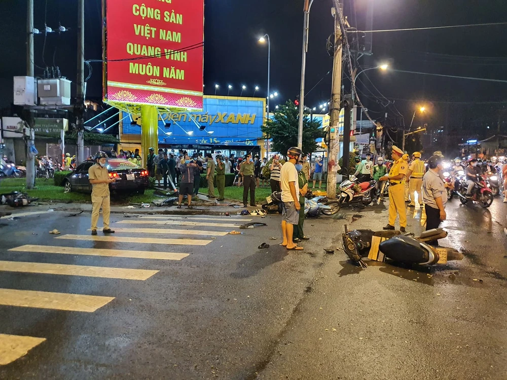 Tại hiện trường các xe máy của nạn nhân nằm la liệt. Một số nhân chứng cho hay, sau khi tông vào dòng người chờ đèn đỏ, ô tô tiếp tục lao vào cột điện mới dừng lại.