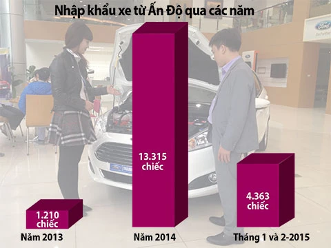 Số liệu thống kê của Tổng cục Hải quan cho biết tổng lượng ô tô nhập khẩu có xuất xứ từ Ấn Độ trong hai tháng đầu năm 2015 đạt 4.363 chiếc (cao nhất trong tổng số 12 nước và vùng lãnh thổ mà Việt Nam đang nhập khẩu ô tô). Xếp sau là Hàn Quốc, Trung Quốc và Thái Lan.