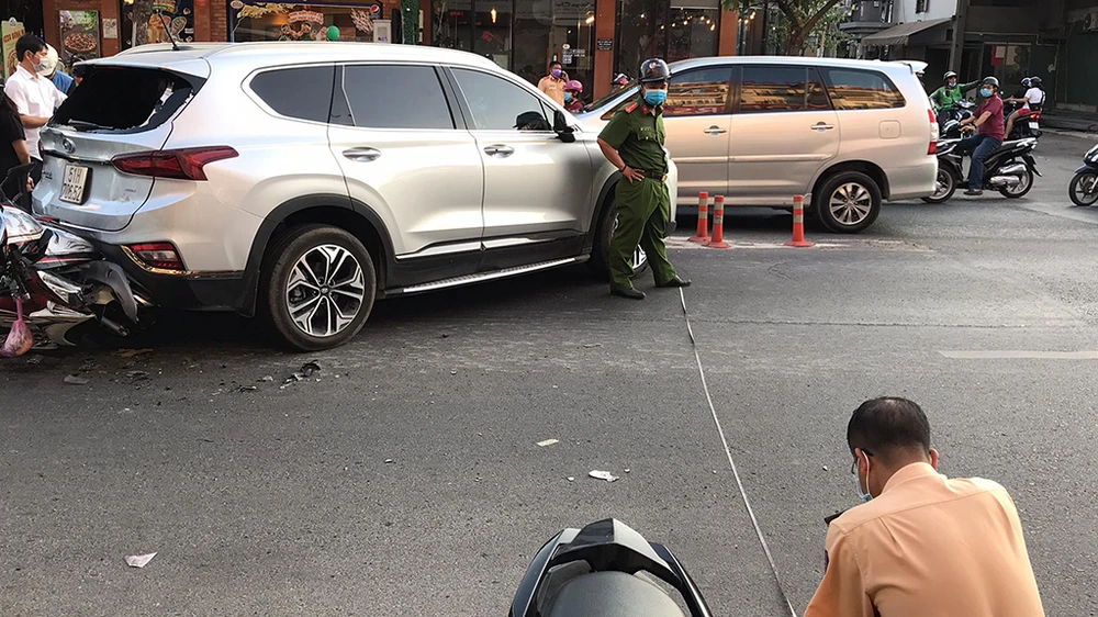 Đúng lúc này, xe máy biển số 59S1-364.57 do người đàn ông chở vợ lưu thông phía sau không xử lý kịp tông vào đuôi ô tô. Một ô tô bốn chỗ khác từ phía sau cũng tông vào đuôi xe máy tạo nên vụ tai nạn liên hoàn.