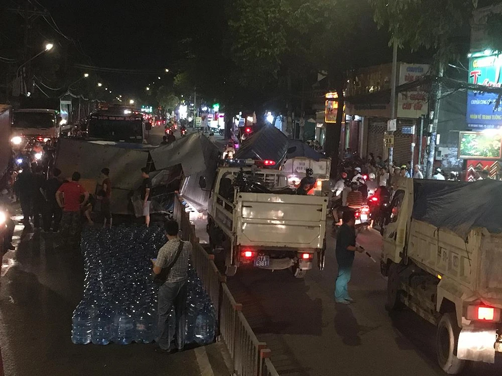 Tại hiện trường, gần 10 m dải phân cách bị cày nát, xe tải lật ngang hư hỏng nặng phần đầu, dầu nhớt chảy lênh láng khắp mặt đường. Vụ việc khiến giao thông qua khu vực bị ùn tắc kèo dài cả 2 chiều.