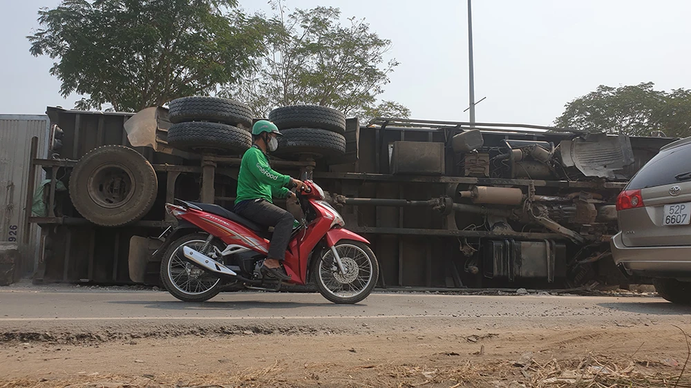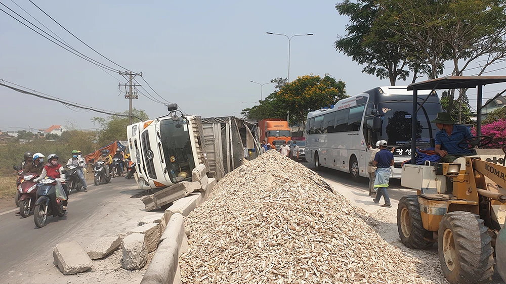 Khoảng 5 giờ sáng 7-3, ô tô tải nặng chở nhiều tấn sắn khô chạy trên quốc lộ 22 theo hướng từ huyện Củ Chi về huyện Hóc Môn (TP.HCM).