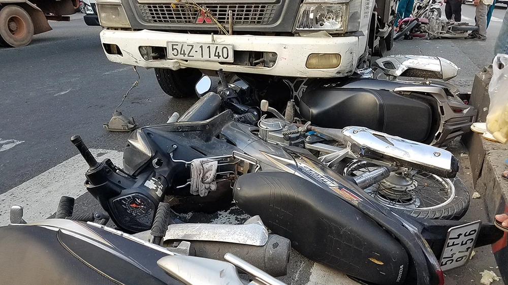 Chiếc xe tải băng qua giao lộ, tông nhiều xe máy ở Bình Tân chiều 6-1. Ảnh HT.