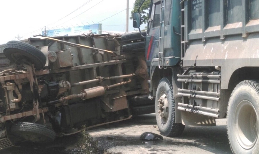 Tại hiện trường, đầu xe ben móp méo, hư hỏng nặng. Chiếc xe tải lật nằm chắn ngang đường, hư hỏng phần đầu và hông xe.