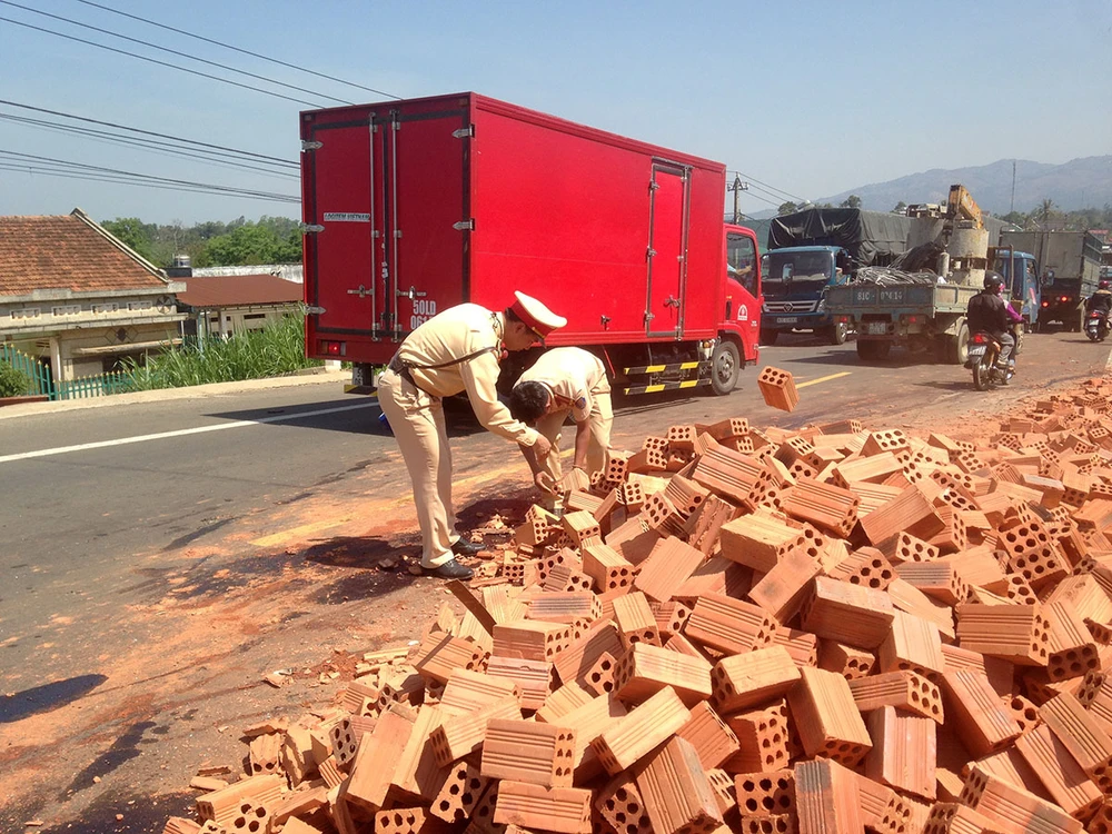 Vụ tai nạn đã khiến một làn đường bị tê liệt. Cảnh sát giao thông đã nhanh chóng có mặt để xử lý hiện trường, dọn gạch rơi vãi, điều tra vụ tai nạn.