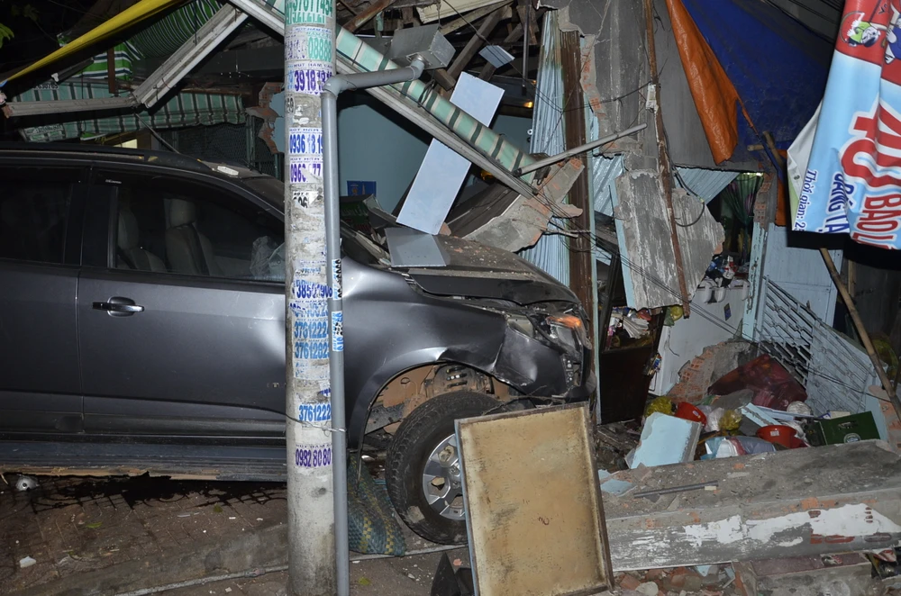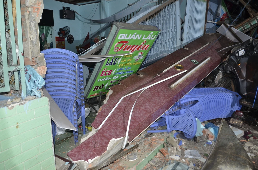 Căn nhà của chị Bạch bị sập một phần phía trước, nhiều vật dụng sinh hoạt và tài sản ở đây hư hại. Cạnh đó, trên vỉa hè la liệt xe máy của người dân hư hỏng khi bị xe ô tô bán tải tông vào. Chiếc ô tô bán tải bị một thanh bê tông đè lên, phần đầu đâm mạnh vào nhà dân hư hại.