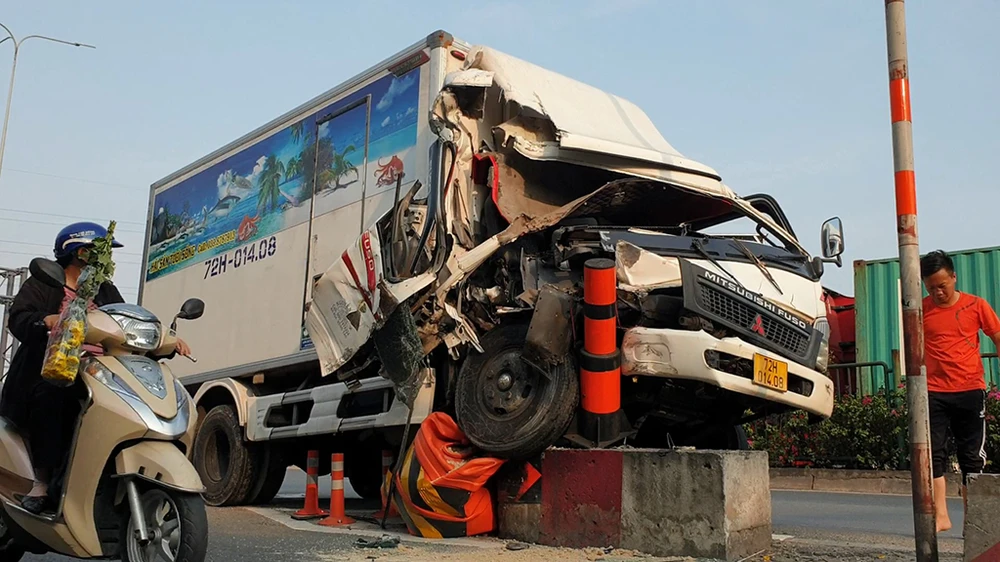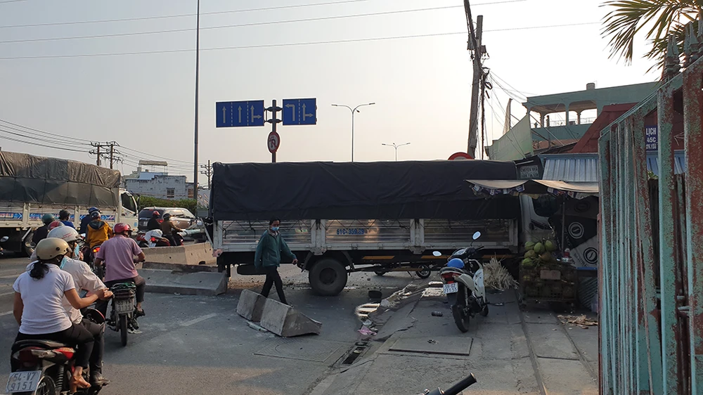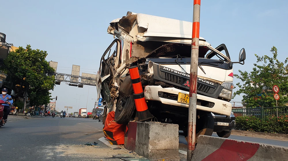 Tài xế xe tải mất phanh chủ động tông vào dải phân cách giữa hai làn đường để tránh gây tai nạn. Ảnh: NT